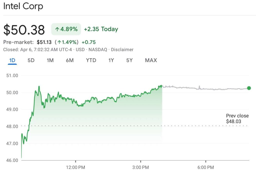 Intel shares closed at $50.38 on April 2, rising 4.89% on the day, and continued higher in pre-market trading on April 6 to around $51.13, reflecting positive investor reaction to the upgrade.