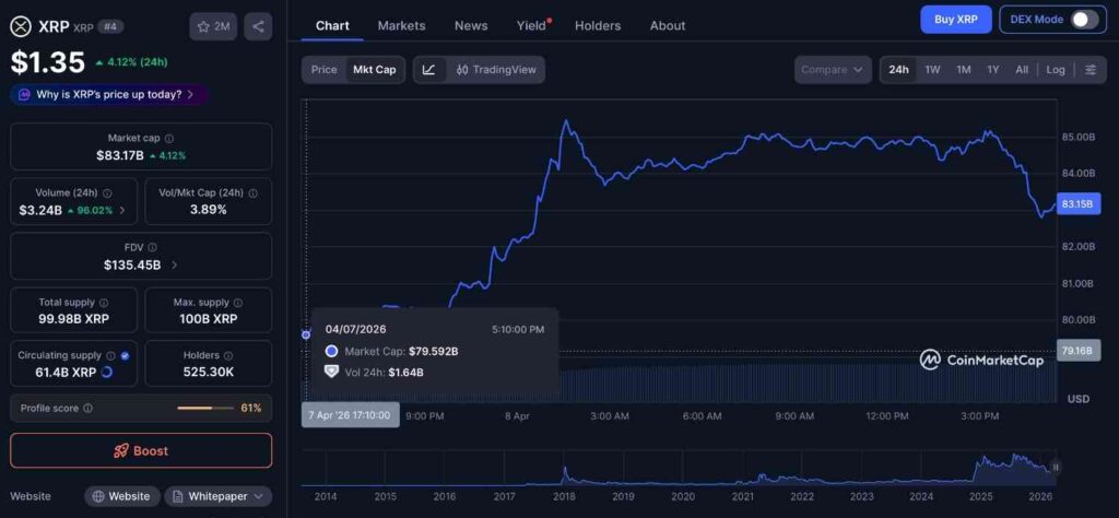 XRP recorded a strong move higher over the past 24 hours, rising 4.03% to $1.35 and adding roughly $3.2 billion to its total market capitalization, which now stands at approximately $83.17 billion.