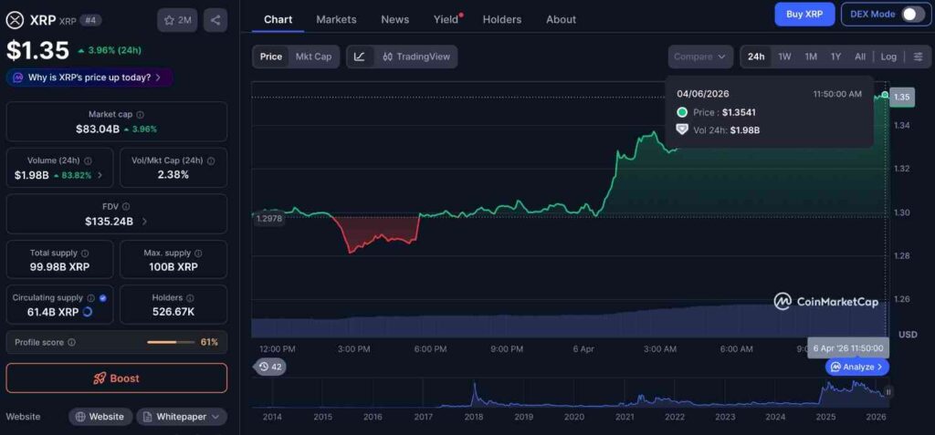 XRP is currently trading around $1.35, up 3.94% on the day, as it tracks the broader crypto rebound. However, its short-term trajectory remains tightly linked to Bitcoin’s performance.